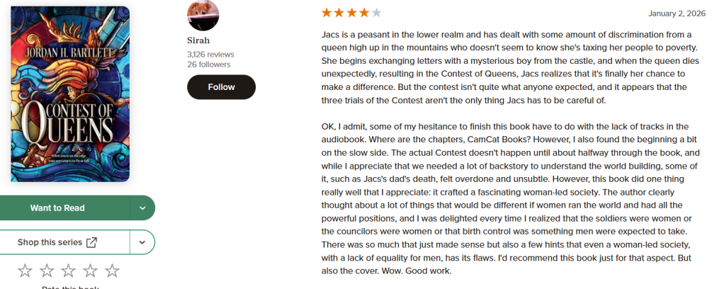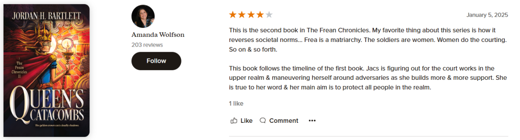 Reviews are so helpful in getting word of Contest of QueensQueen’s Catacombs , and Queendom Come out there. If you have time, and if you’ve read the book, I would be eternally grateful if you could leave a star rating and/or a written review on Goodreads or Amazon.