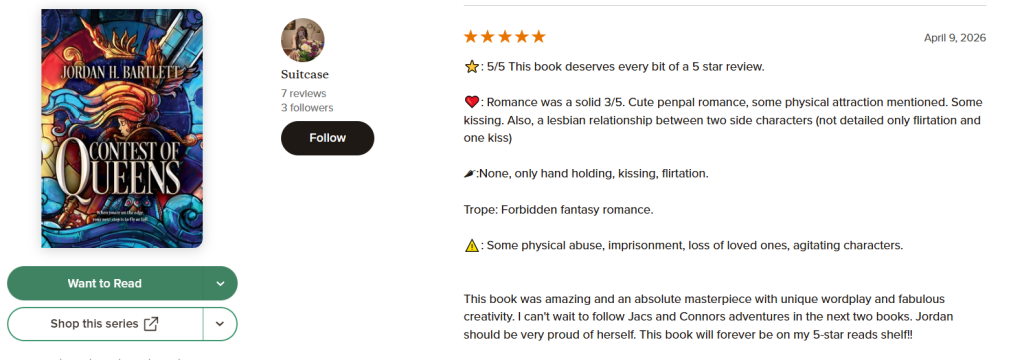 Reviews are so helpful in getting word of Contest of Queens, Queen’s Catacombs , and Queendom Come out there. If you have time, and if you’ve read the book, I would be eternally grateful if you could leave a star rating and/or a written review on Goodreads or Amazon.