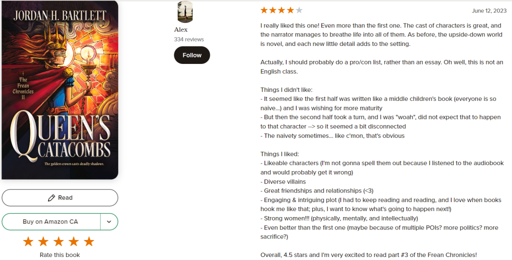 Reviews are so helpful in getting word of Contest of Queens, Queen’s Catacombs , and Queendom Comeout there. If you have time, and if you’ve read the book, I would be eternally grateful if you could leave a star rating and/or a written review on Goodreads or Amazon.